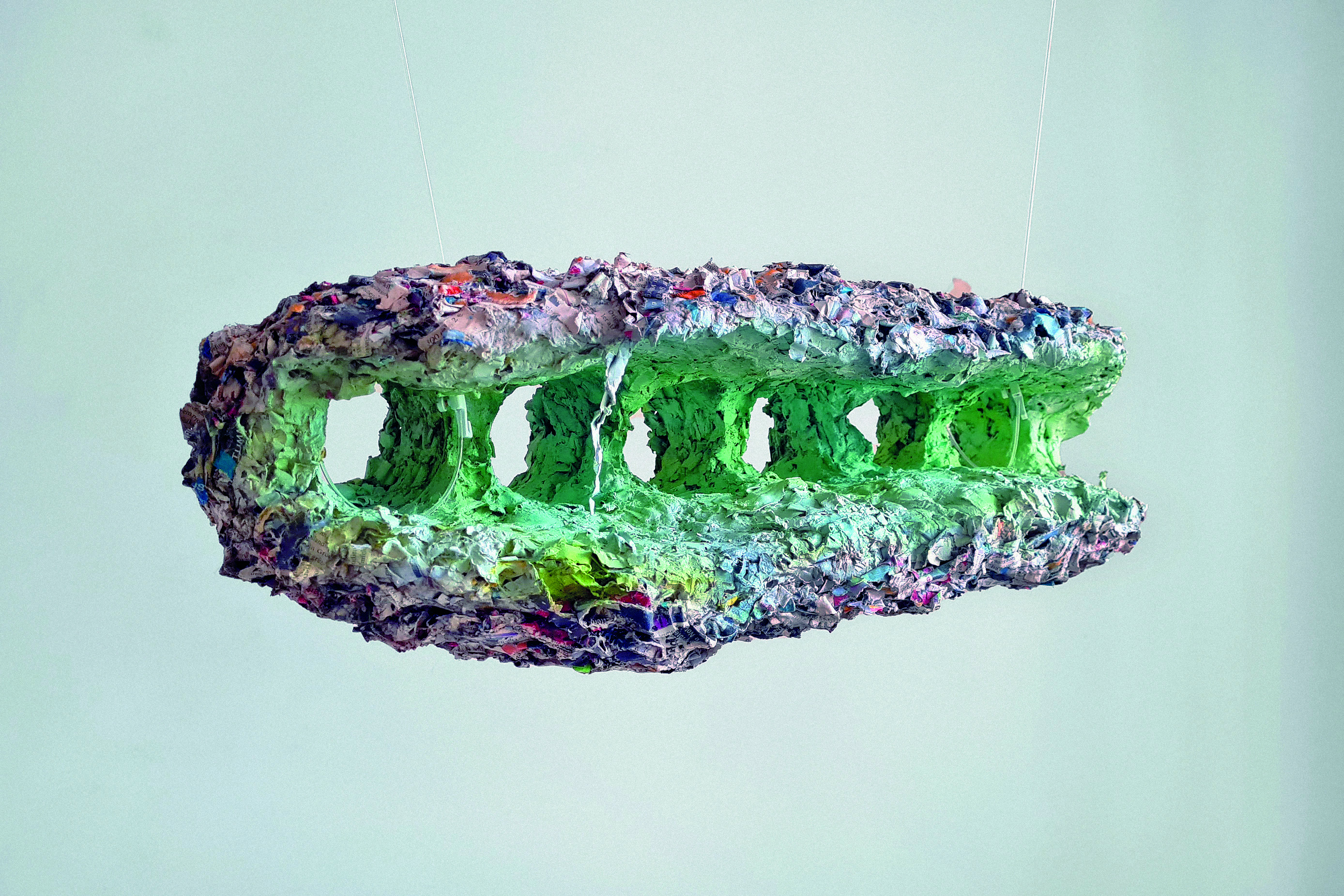 Lutz Schäfer arbeitet bevorzugt mit Papier und Pappmaché, in Installationen und Objekten verarbeitet er Alltags- und Kulturgüter – wie juristische Texte oder ausgediente Bücher – zu ironisch-reflektierenden Arbeiten. Er schafft räumliche Gebilde aus der Papiermasse, die bauchig, gestreckt und auch wulstig sein können. Die Papierkörper schmiegen sich um Kanten, rollen sich ein und scheinen mit ihrer Unterlage verwachsen zu sein. Durch zahllose Farbschichten auf Papier entstehen körperhafte Gebilde. Schäfer studierte Bildhauerei bei Stephan Balkenhol an der Akademie der Bildenden Künste Karlsruhe, er hatte Lehraufträge an der TH Karlsruhe inne und promovierte an der Fakultät für Bildende Kunst in Berlin.